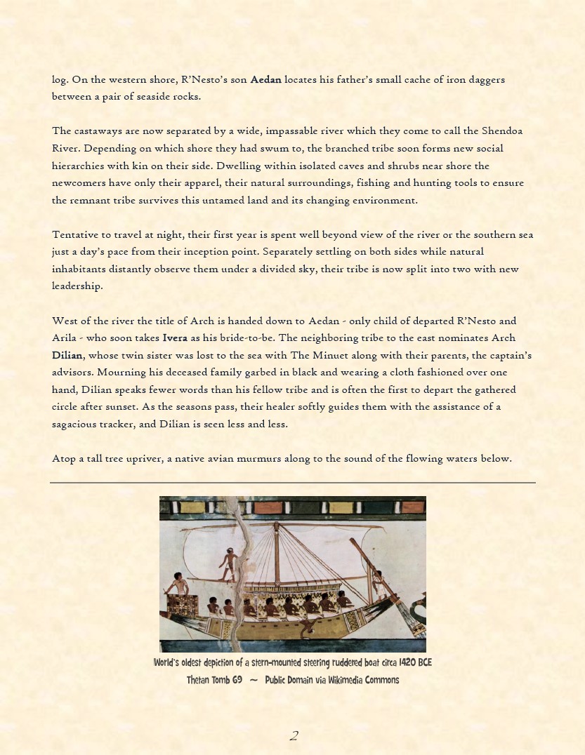 Arriving in this uncertain world amid blustery climate, the iron and timber hull of The Minuet runs into underwater rock formations and sinks where the river meets the sea. The crew swims to the shorelines; of the sixty souls onboard, only forty are known to have survived. The captain, Arch R’Nesto, went down with the ship and drowned along with twenty of the tribe, including their elders and an infant who were unable to swim to land nearby.