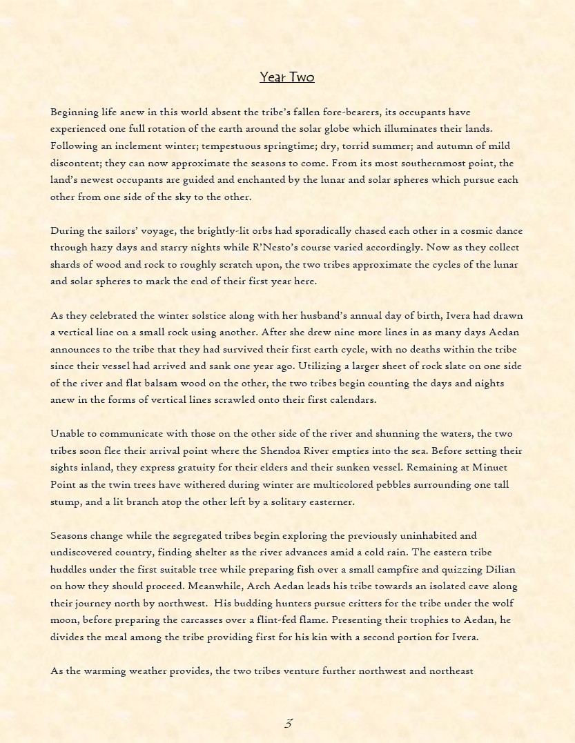 During the sailors’ voyage, the brightly-lit orbs had sporadically chased each other in a cosmic dance through hazy days and starry nights while R’Nesto’s course varied accordingly. Now as they collect shards of wood and rock to roughly scratch upon, the two tribes approximate the cycles of the lunar and solar spheres to mark the end of their first year here.