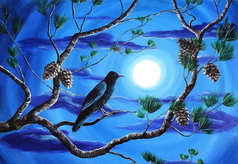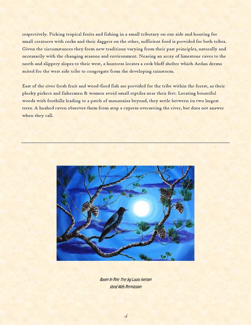 East of the river fresh fruit and wood-fired fish are provided for the tribe within the forest, as their plucky pickers and fishermen & women avoid small reptiles near their feet. Locating bountiful woods with foothills leading to a patch of mountains beyond, they settle between its two largest trees. A hushed raven observes them from atop a cypress overseeing the river, but does not answer when they call.
