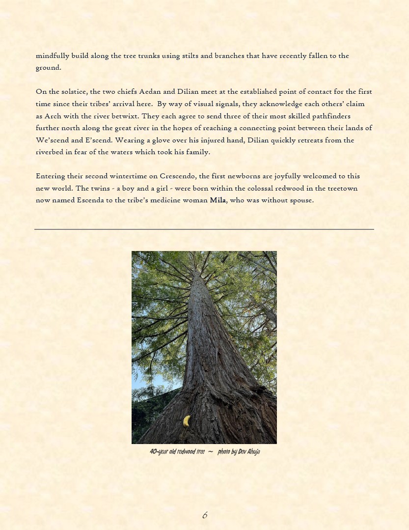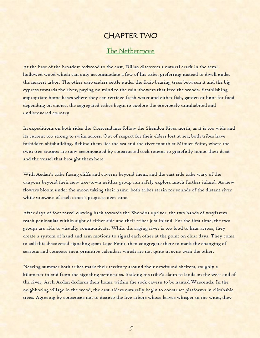 Nearing summer both tribes mark their territory around their newfound shelters, roughly a kilometer inland from the signaling peninsulas. Staking his tribe’s claim to lands on the west end of the river, Arch Aedan declares their home within the rock cavern to be named Wescenda. In the neighboring village in the wood, the east-siders naturally begin to construct platforms in climbable trees. Agreeing by consensus not to disturb the live arbors whose leaves whisper in the wind, they mindfully build along the tree trunks using stilts and branches that have recently fallen to the ground.