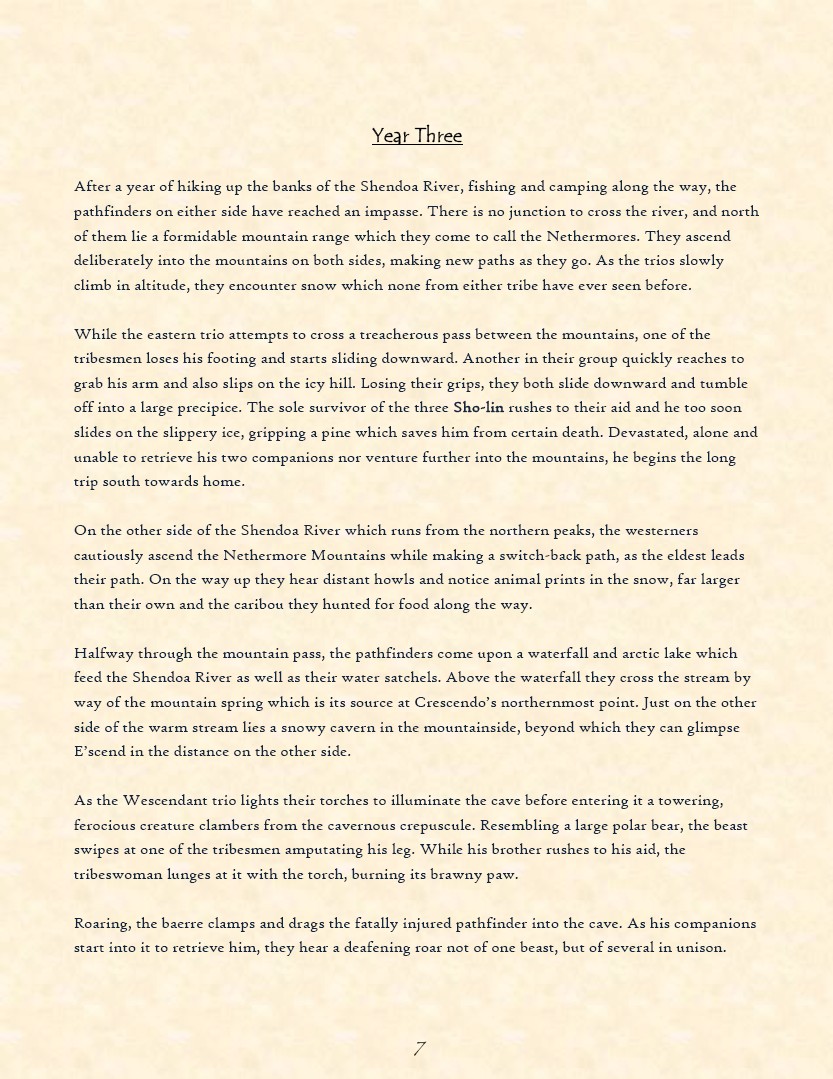 On the other side of the Shendoa River which runs from the northern peaks, the westerners cautiously ascend the Nethermore Mountains while making a switch-back path, as the eldest leads their path. On the way up they hear distant howls and notice animal prints in the snow, far larger than their own and the caribou they hunted for food along the way.