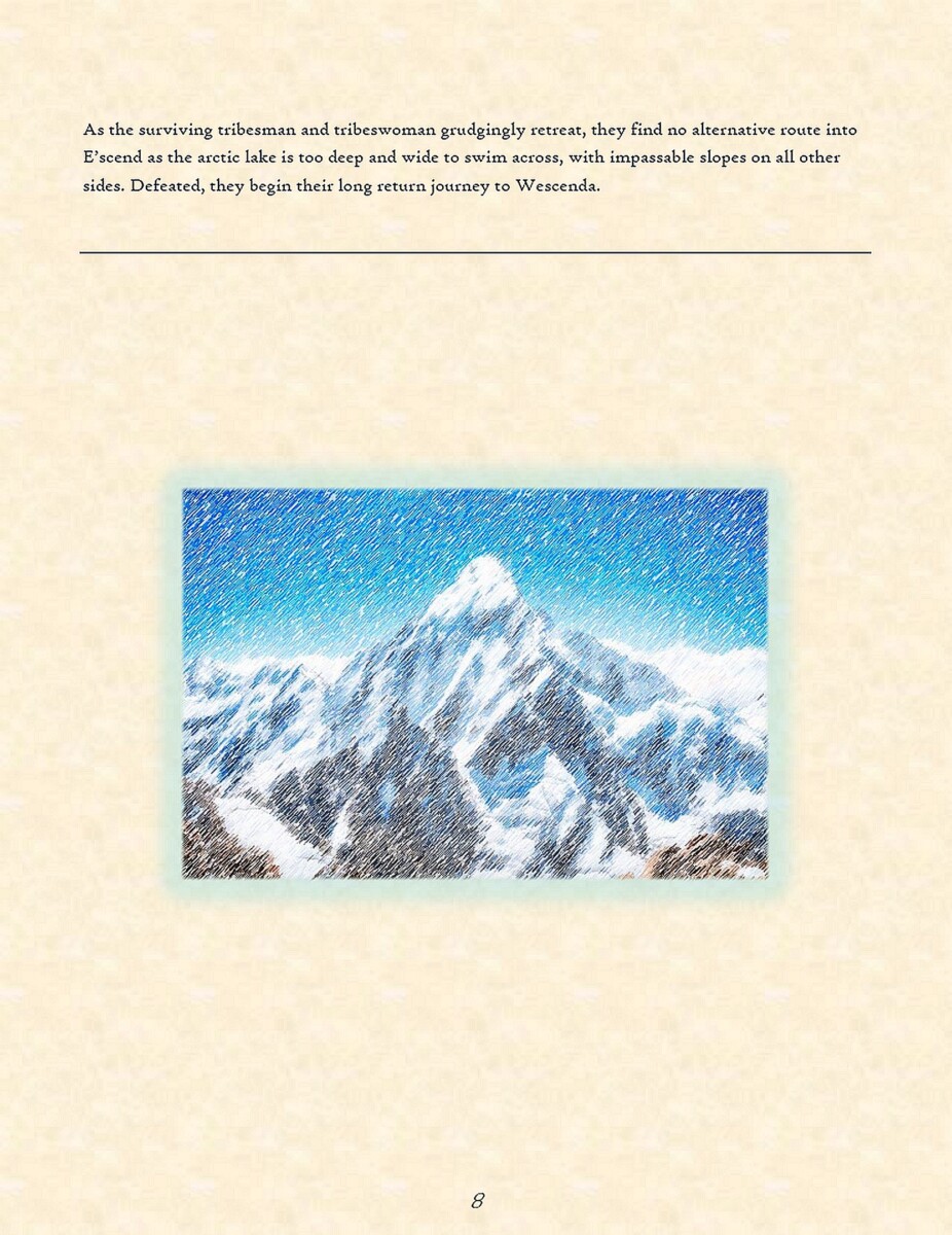 As the surviving tribesman and tribeswoman grudgingly retreat, they find no alternative route into E’scend as the arctic lake is too deep and wide to swim across, with impassable slopes on all other sides. Defeated, they begin their long return journey to Wescenda.
