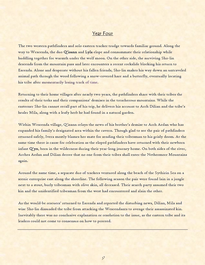 Within Wescenda village, Q’isann relays the news of his brother’s demise to Arch Aedan who has expanded his family’s designated area within the cavern. Though glad to see the pair of pathfinders returned safely, Ivera mostly blames her mate for sending their tribesman to his grisly doom. At the same time there is cause for celebration as the eloped pathfinders have returned with their newborn infant Q’yn, born in the wilderness during their year-long journey home. On both sides of the river, Arches Aedan and Dilian decree that no one from their tribes shall enter the Nethermore Mountains again.