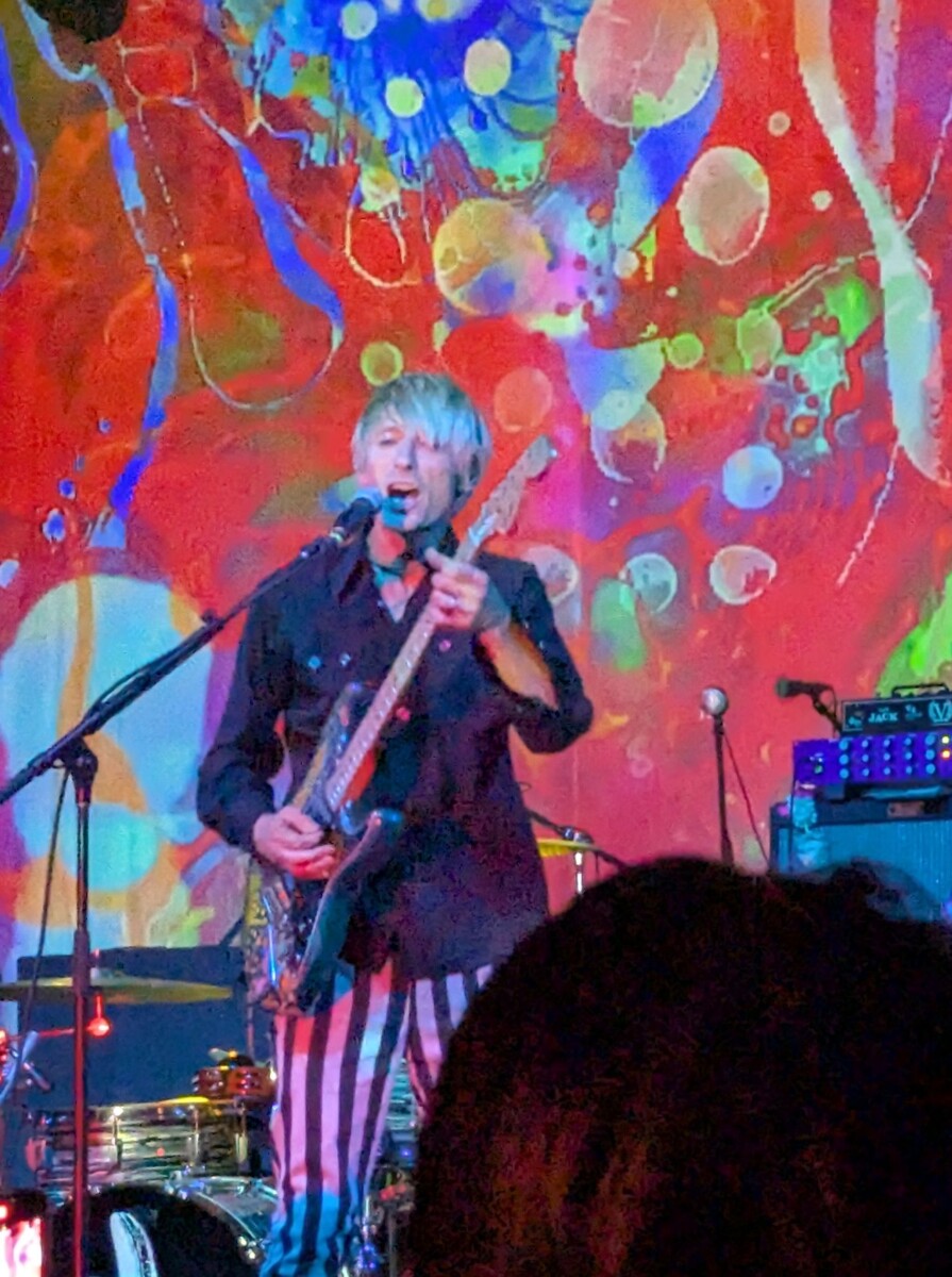 Blond man in dark shirt with striped pants playing guitar and singing onstage with psychedelic background