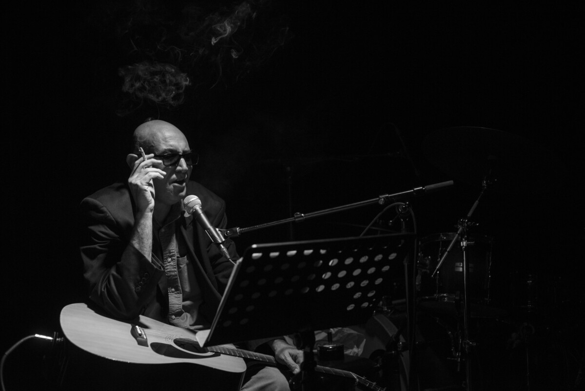 Black and white photo of Alan Bishop with cigarette in one hand singing into microphone